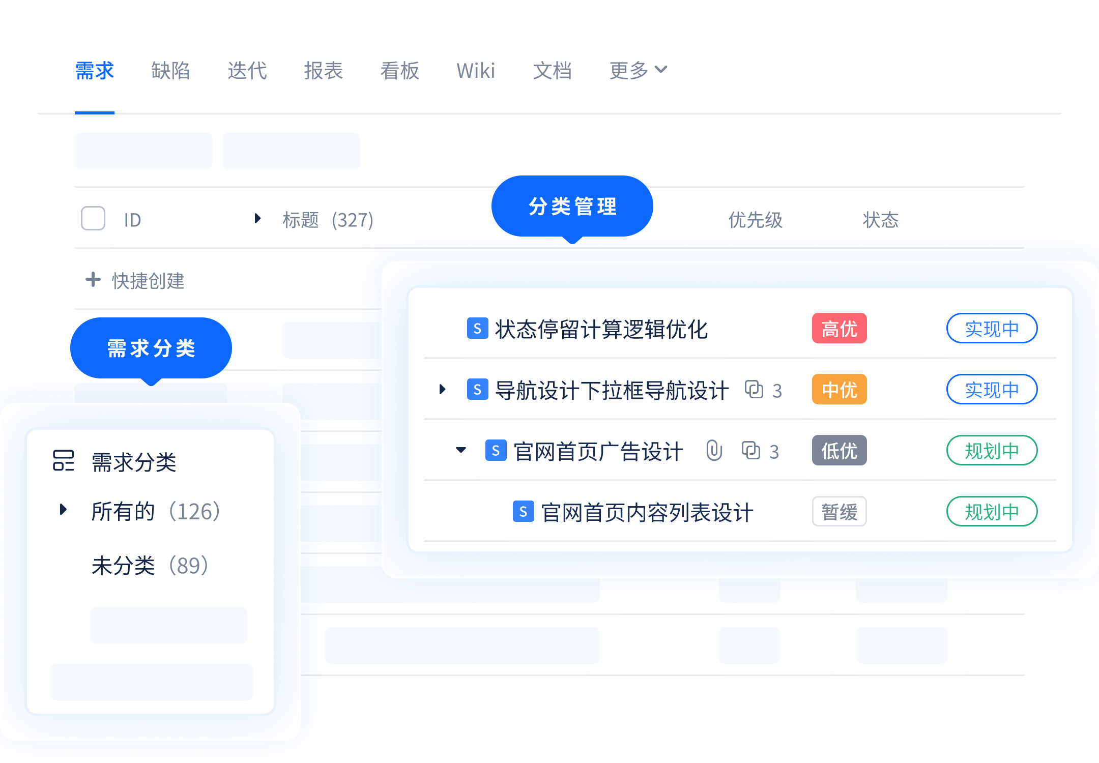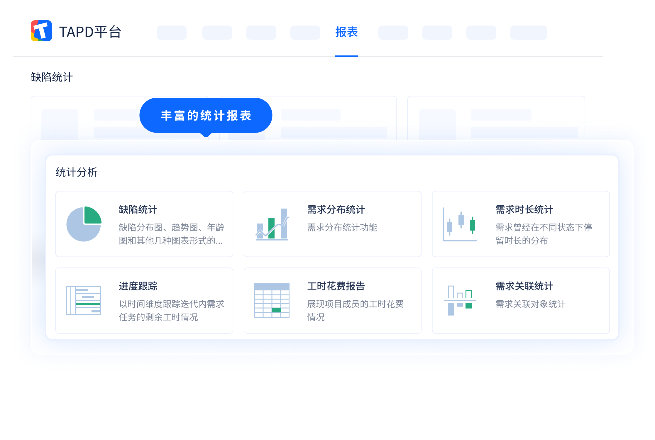 統(tǒng)計(jì)模塊提供了缺陷統(tǒng)計(jì)、需求分布統(tǒng)計(jì)、進(jìn)度跟蹤、工時(shí)花費(fèi)報(bào)告、需求關(guān)聯(lián)統(tǒng)計(jì)等豐富的內(nèi)置報(bào)表外,同時(shí)也支持通過報(bào)表自定義,靈活定制團(tuán)隊(duì)專屬統(tǒng)計(jì)報(bào)表。